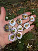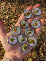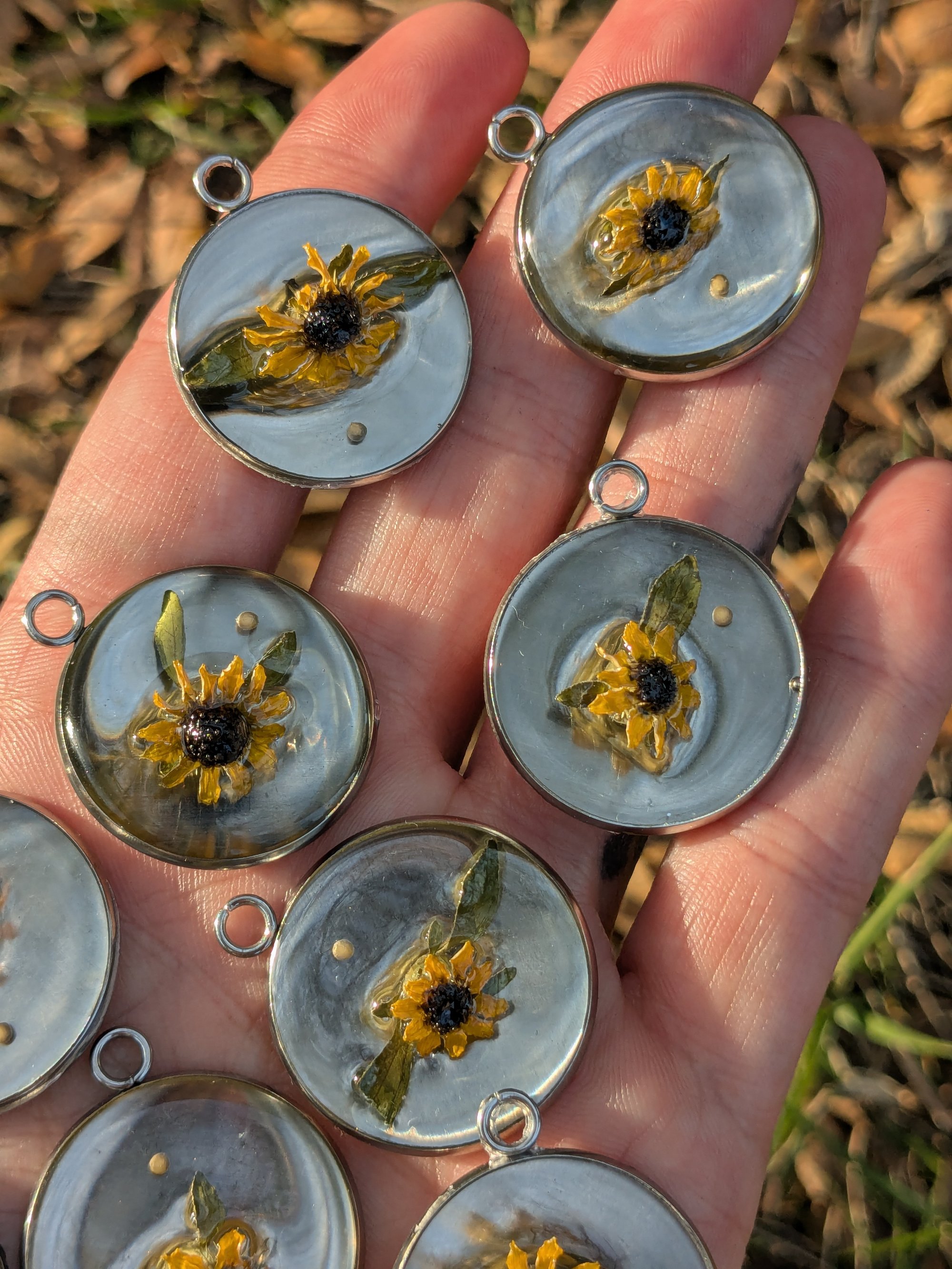 3D mini dried sunflowers from the Ukraine set in clear epoxy with a dainty yellow mustard seed.