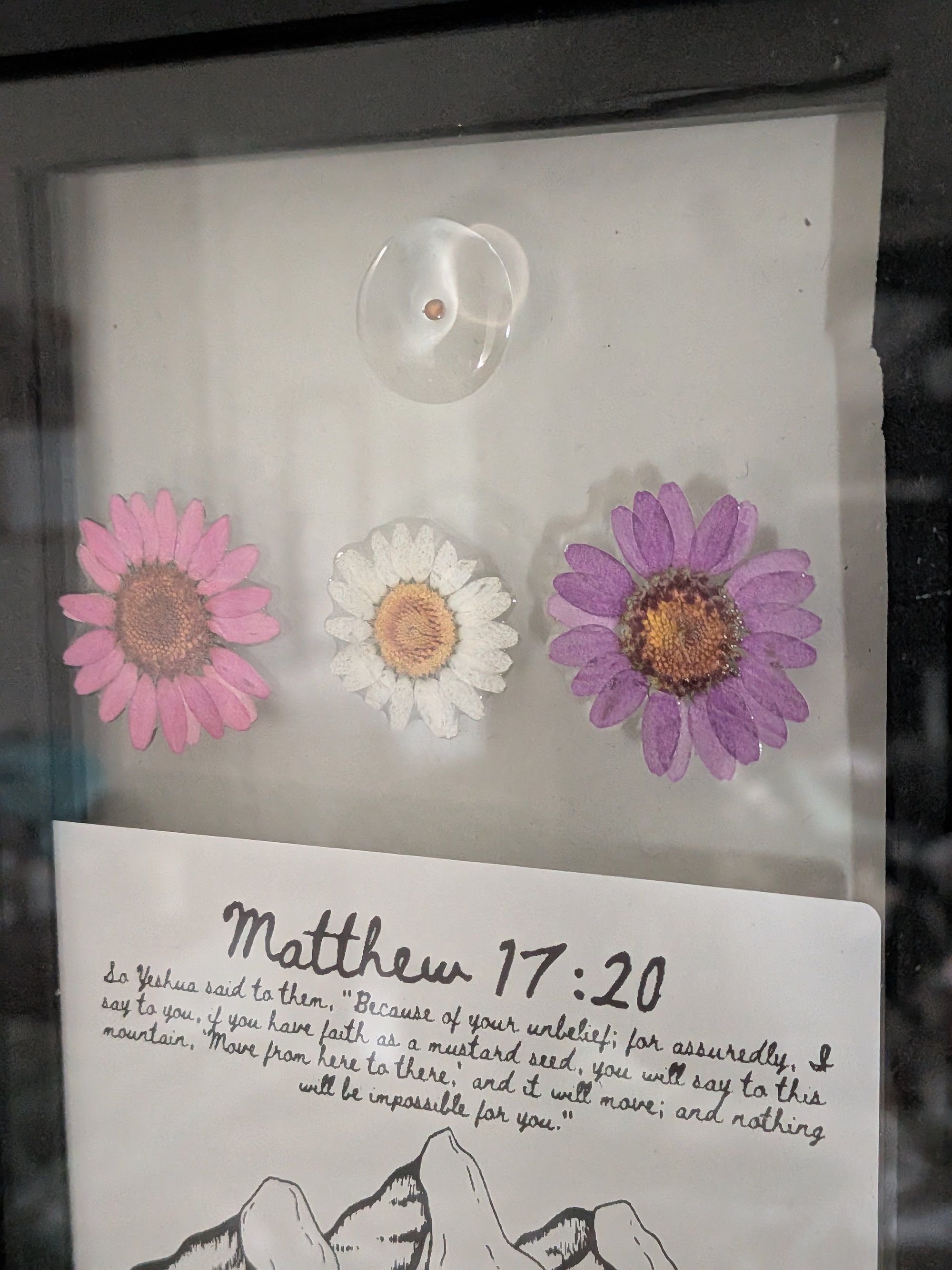 A black 5x7 floating picture frame featuring three real, dried, colorful daisies and a single mustard seed in epoxy. Comes ready to hang!