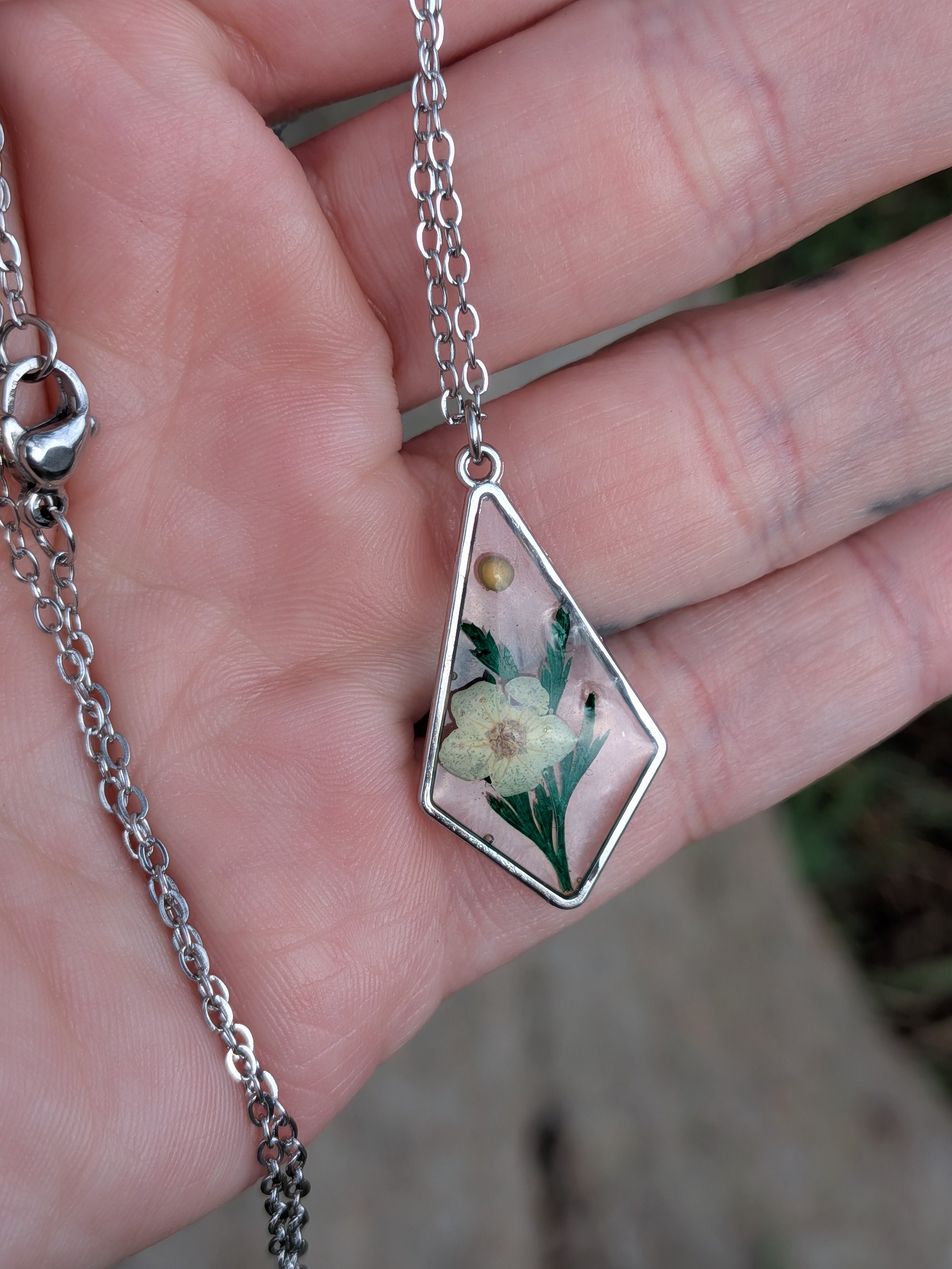 Featuring a unique shaped frame with a dried white Narcissus flower, a fern leaf, and a dainty yellow mustard seed.