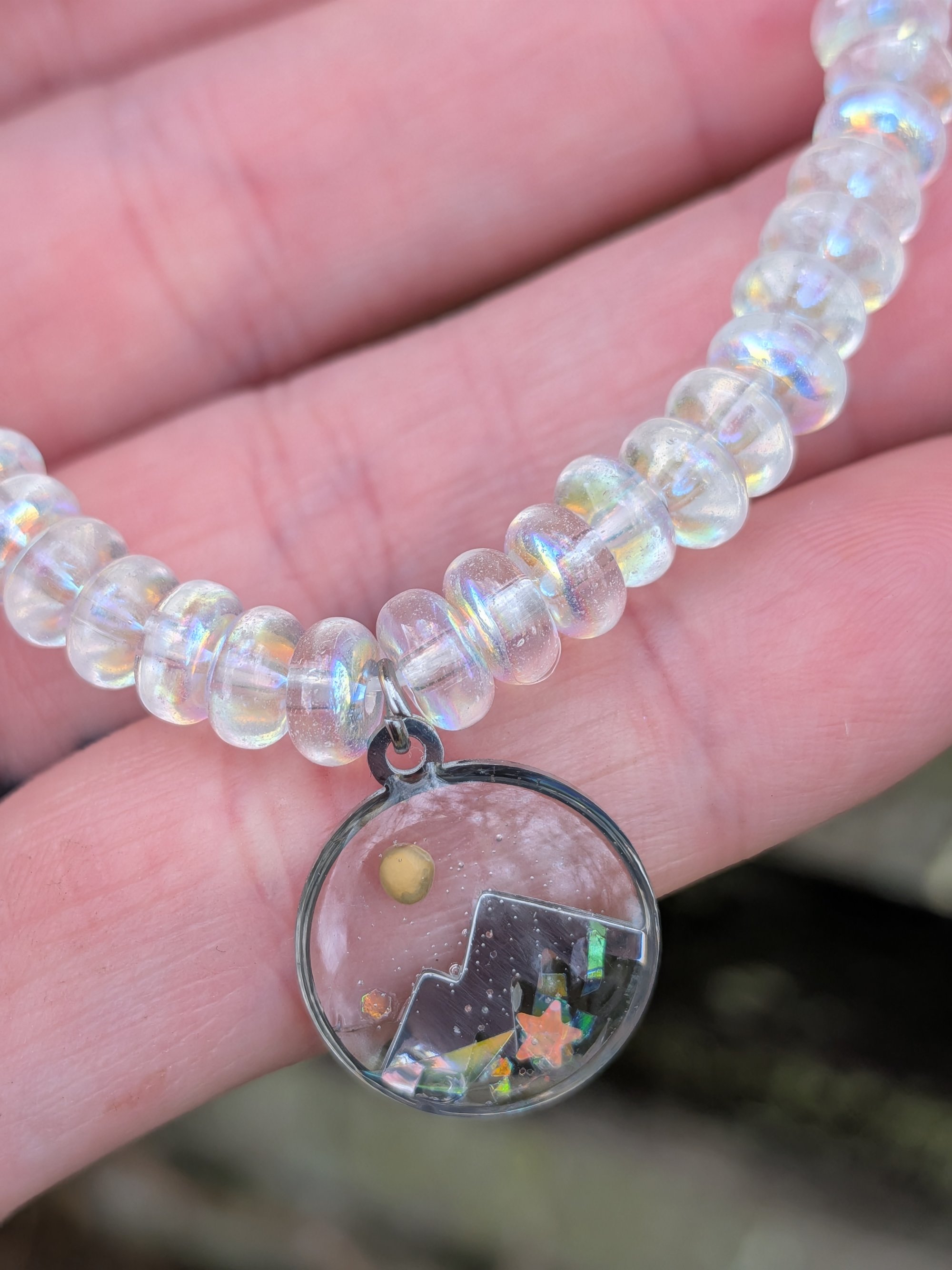 Ethiopian Opal beads featured on a stretchy bracelet with a stainless steel mountain frame featuring sparkle epoxy and a dainty yellow mustard seed.