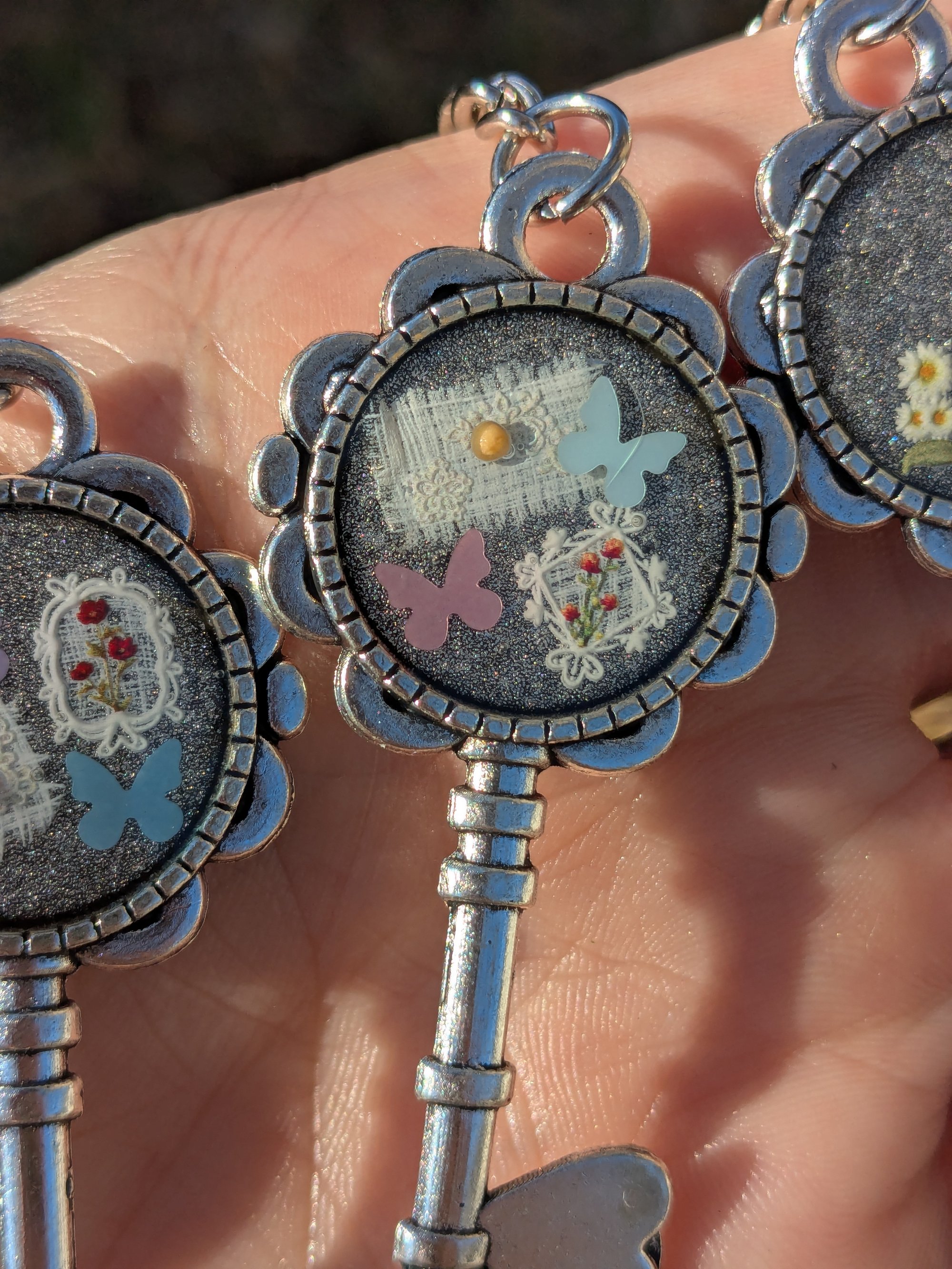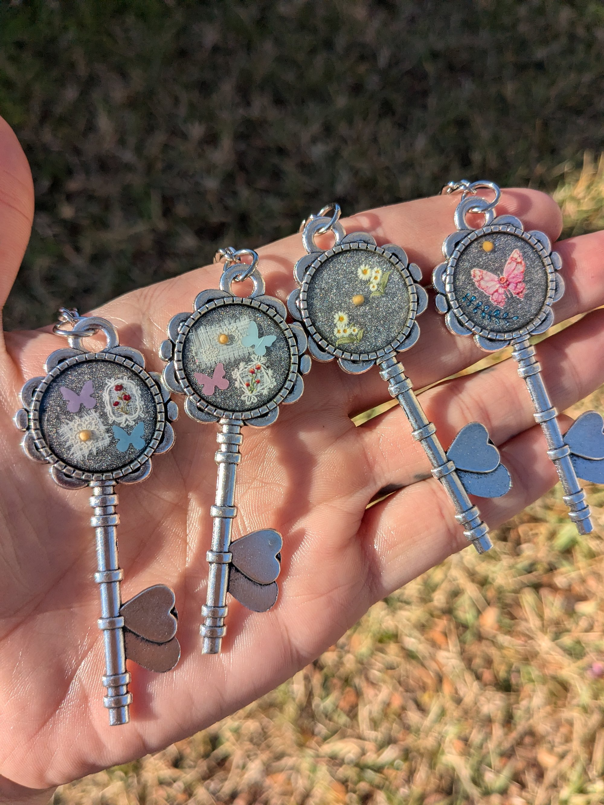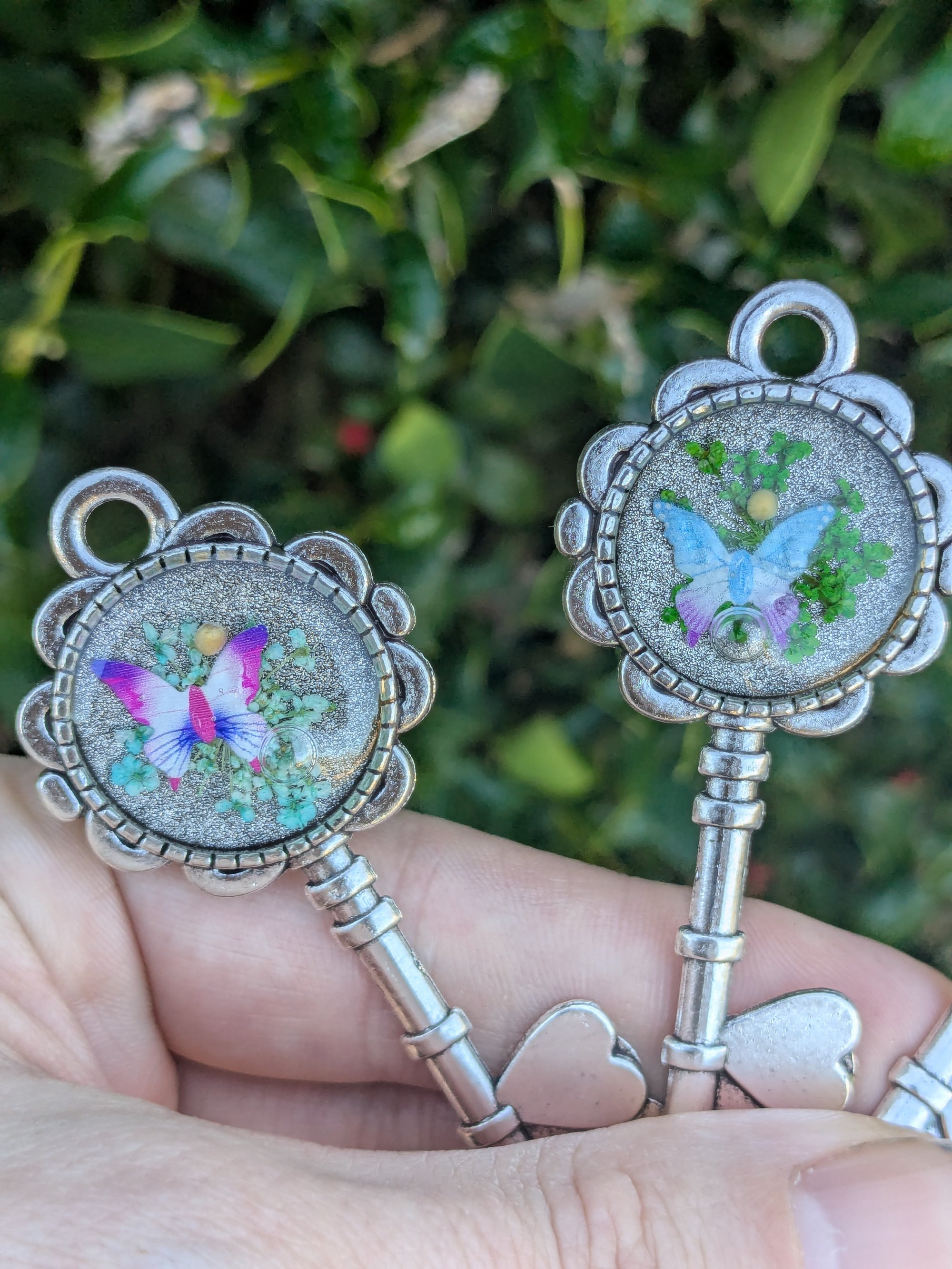 Key shaped keychains featuring clear epoxy, dried flowers, a butterfly charm, and dainty, yellow mustard seeds.