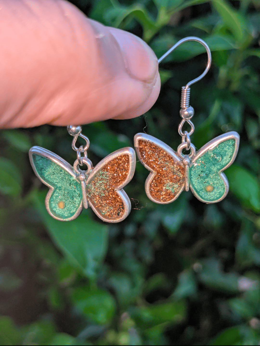Stainless steel butterfly frames featuring sparkly jade green epoxy and gold sparkle epoxy with yellow mustard seeds.