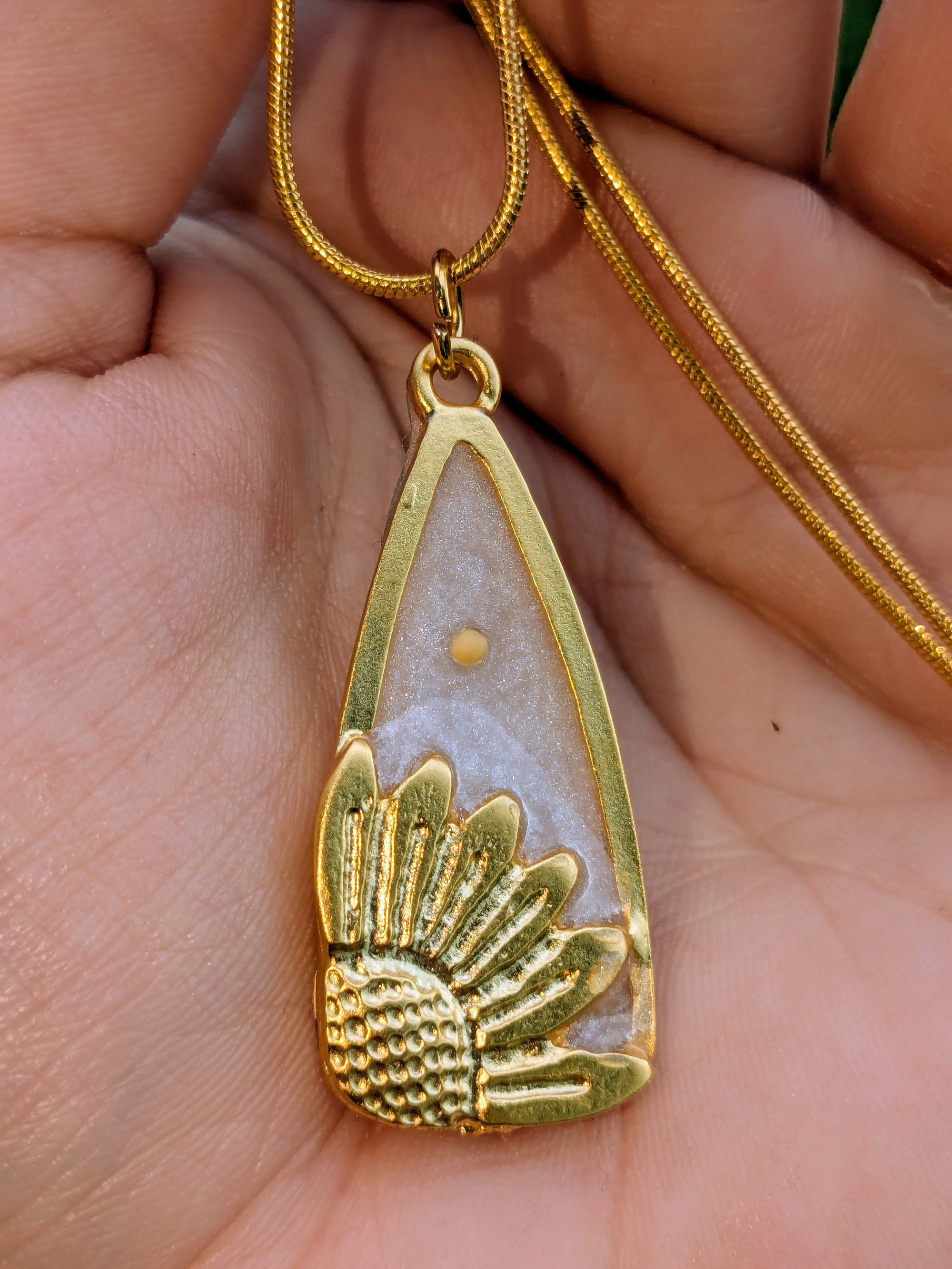 A Gold sunflower accent with pearly white epoxy and a mustard seed.