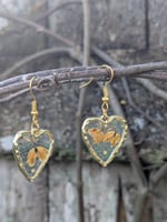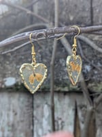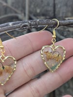 Featuring dainty gold plated heart frames with dried, pressed Lilly of the valley flowers from the Ukraine and a dainty yellow mustard seed and sparkle epoxy!