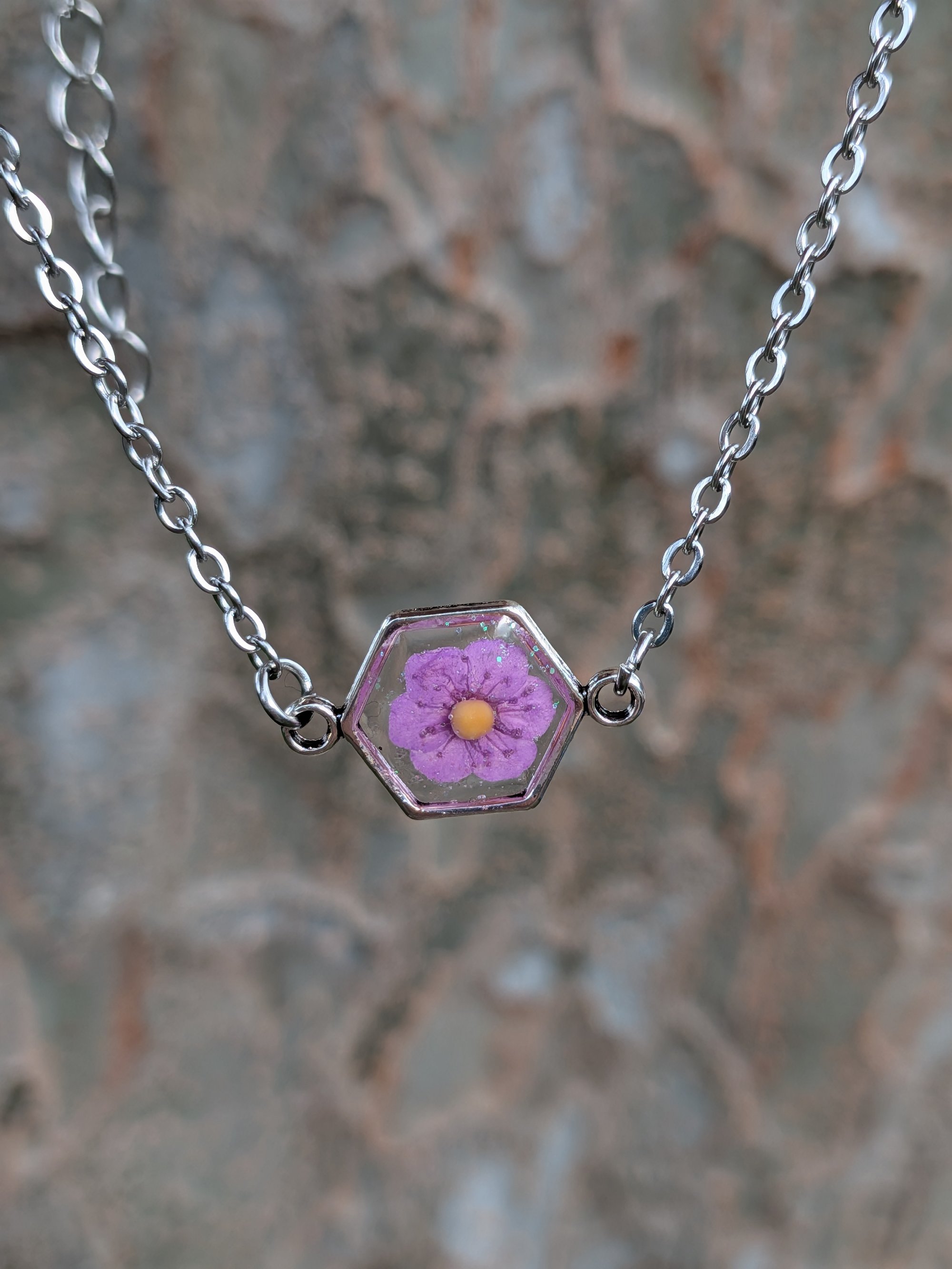 A hexagon frame featuring a dried purple Narcissus flower, sparkle epoxy, and a dainty yellow mustard seed.