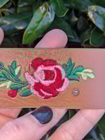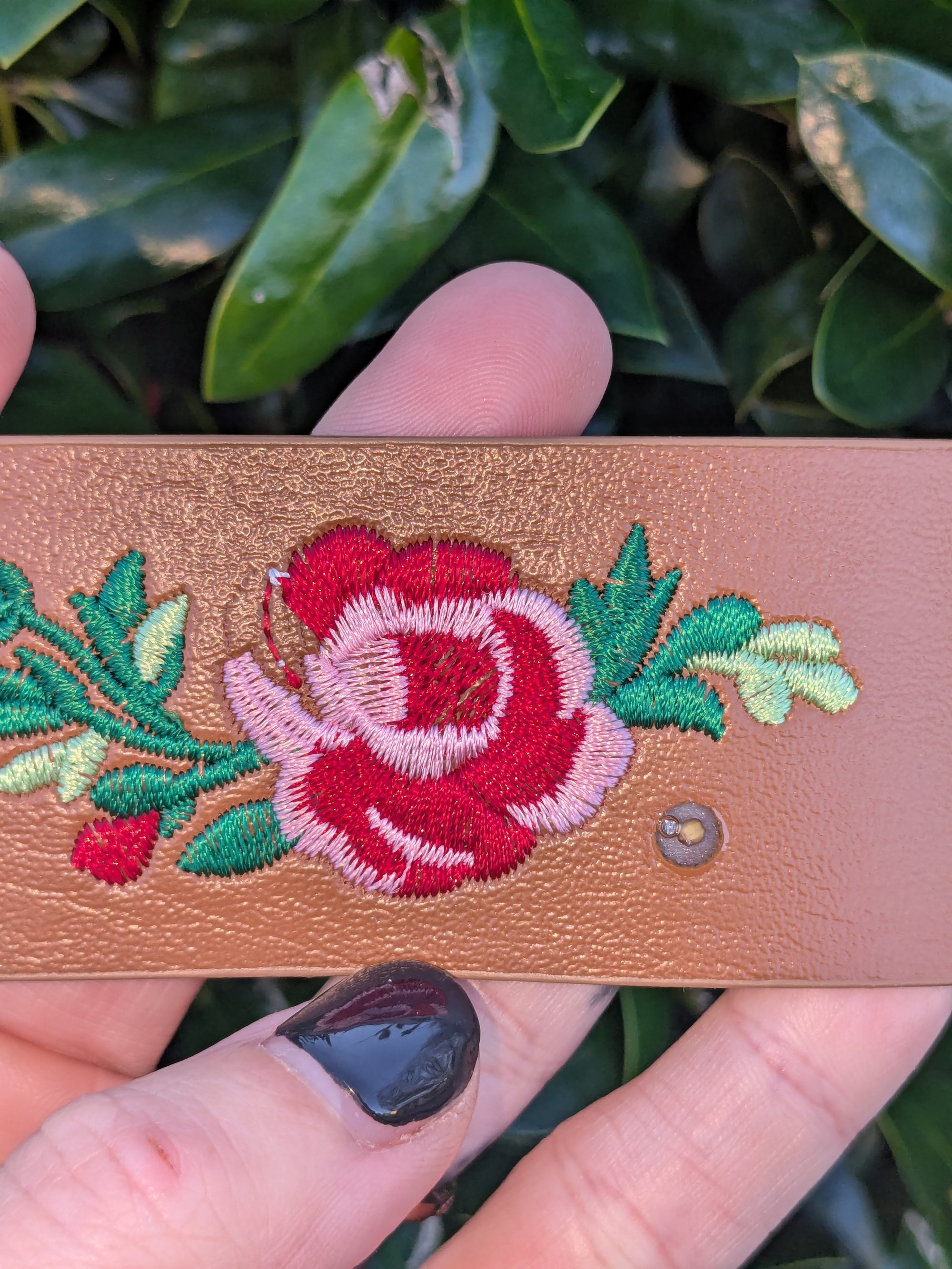 Light brown PU leather bracelet featuring an embroidered rose and a yellow mustard seed in clear epoxy.