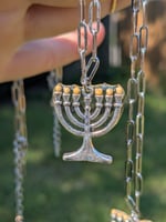 Stainless steel 7-branched menorah pendant with 6 yellow mustard seeds.