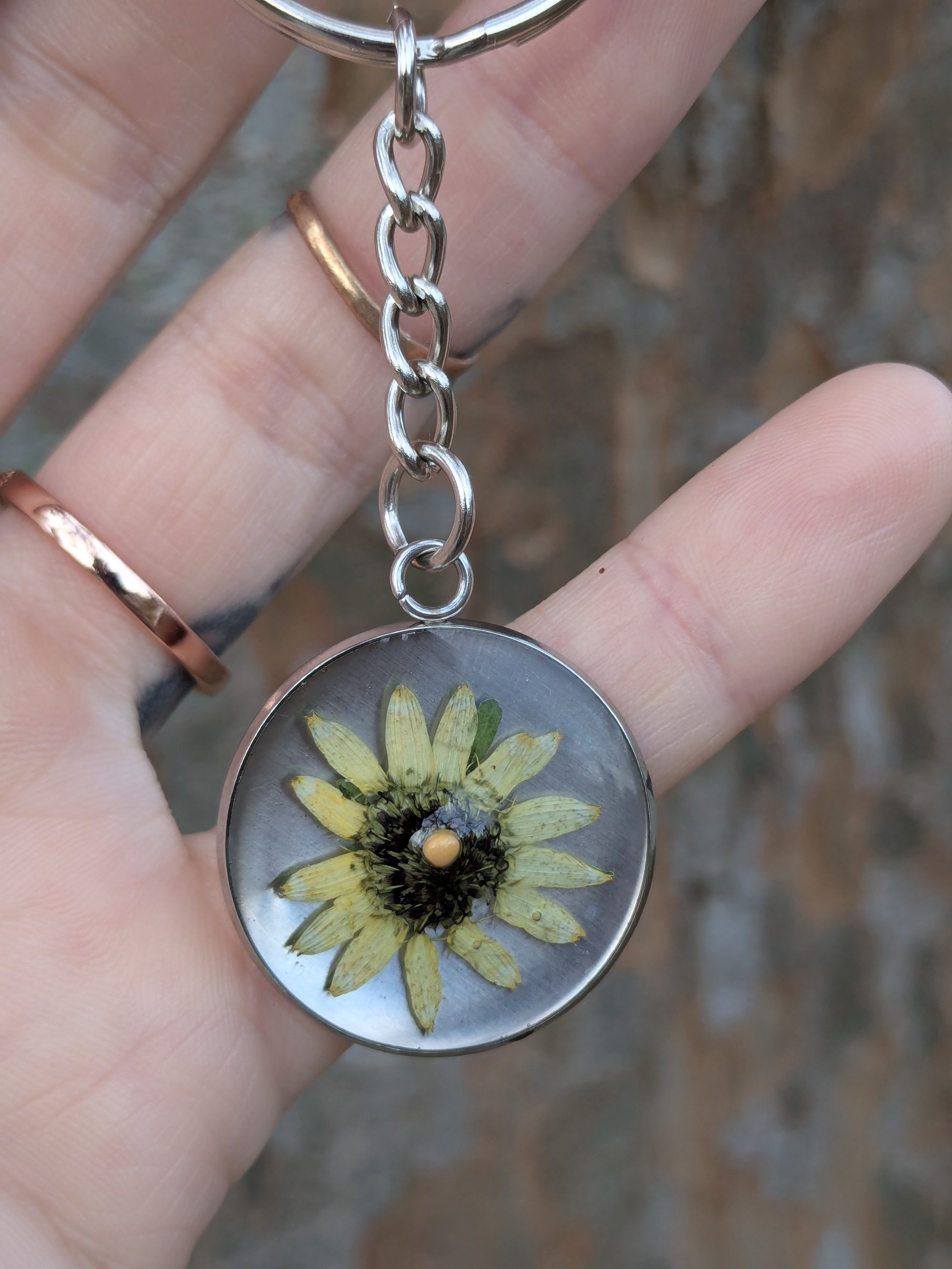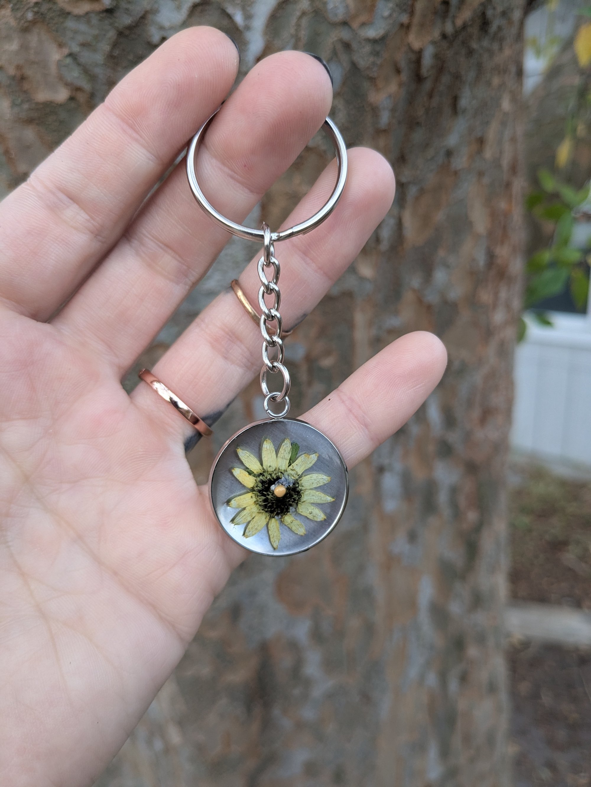 A dainty mini dried sunflower with a yellow mustard seed attached to a stainless steel keychain.