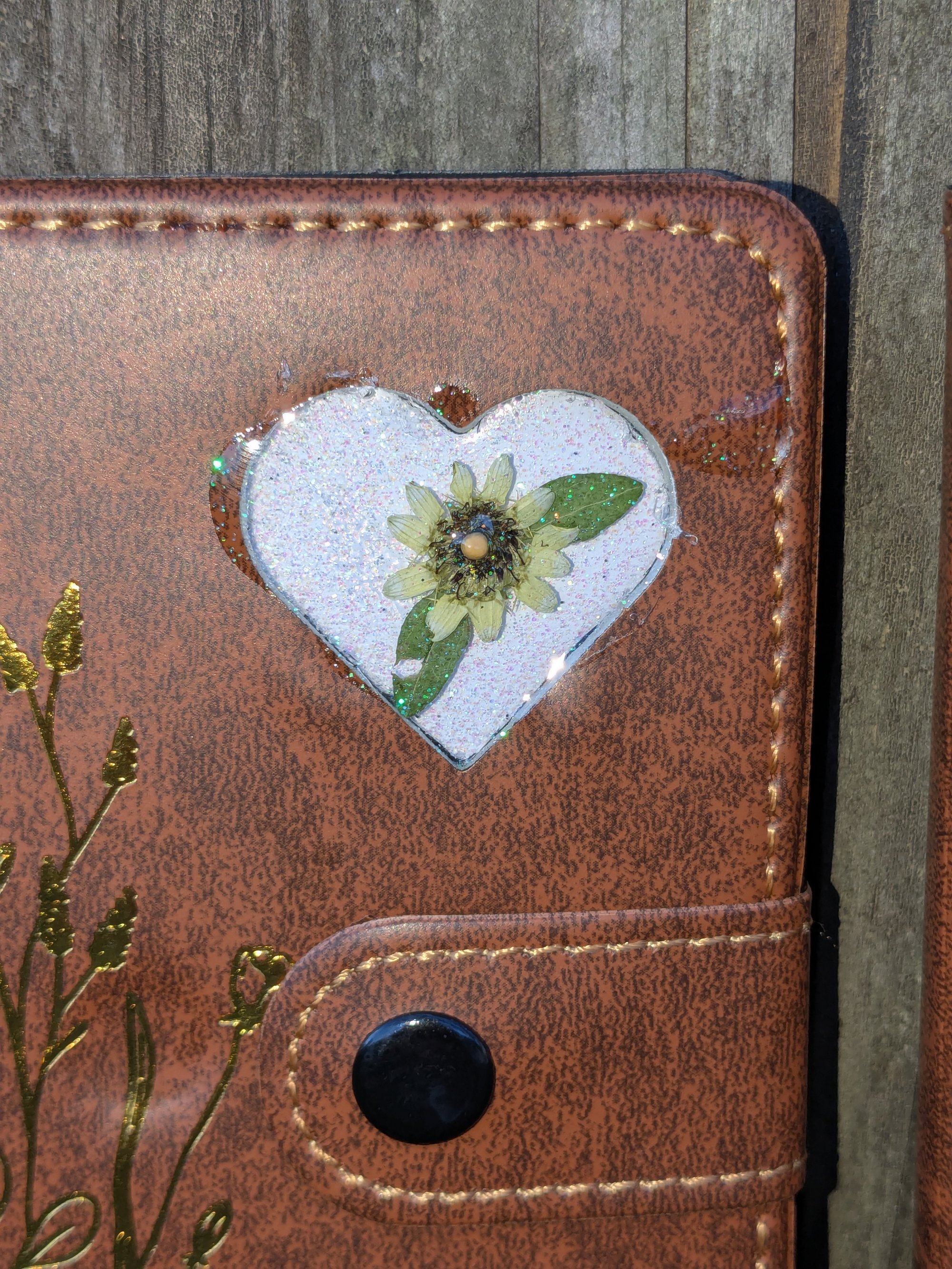 PU Leather Journal featuring real dried mini sunflowers from the Ukraine, sparkle epoxy, and a yellow mustard seed.