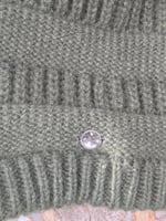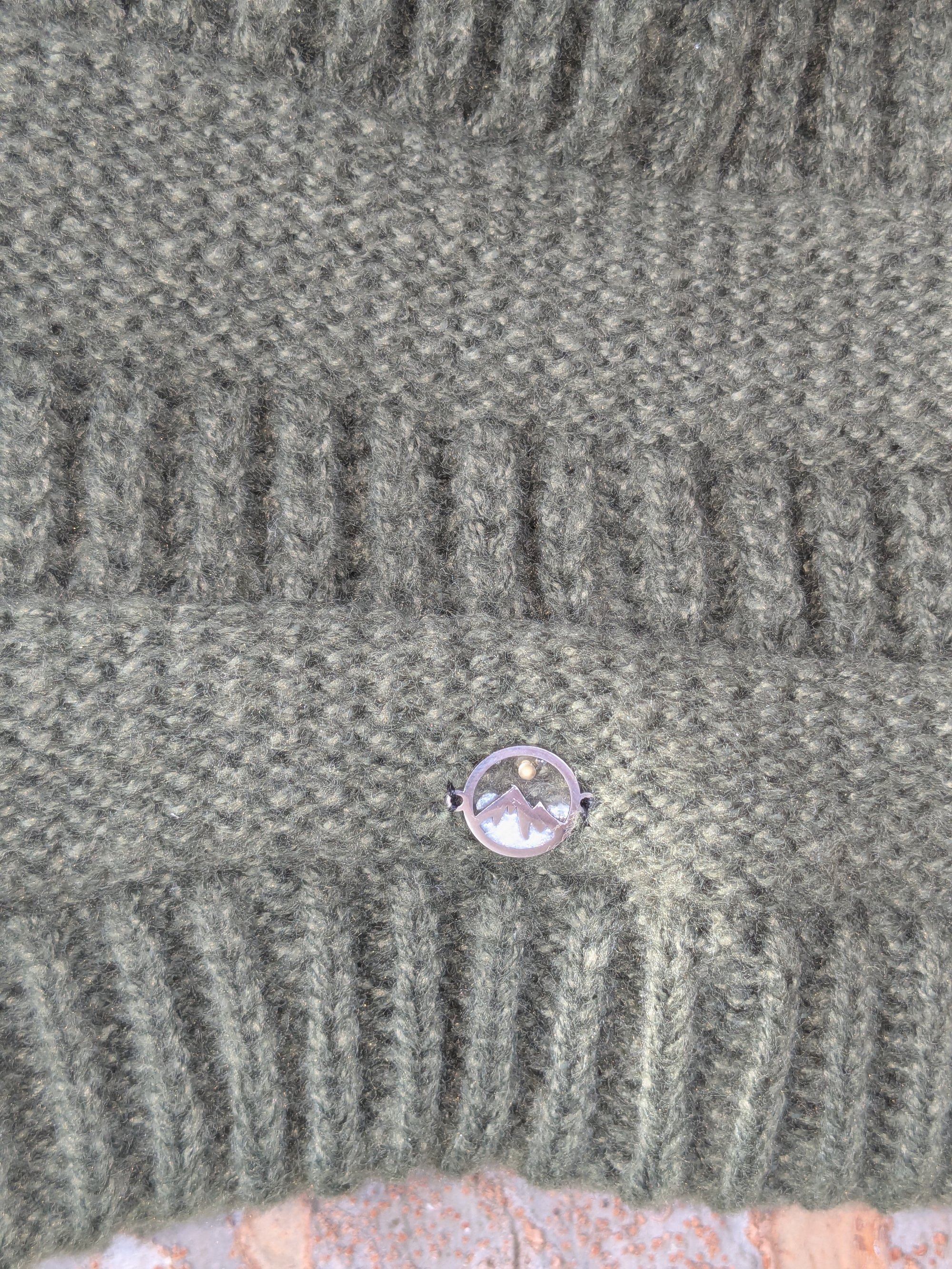 Featuring a soft, slouchy, olive green beanie with a mountain and mustard seed pendant (with white epoxy) sewn onto it.