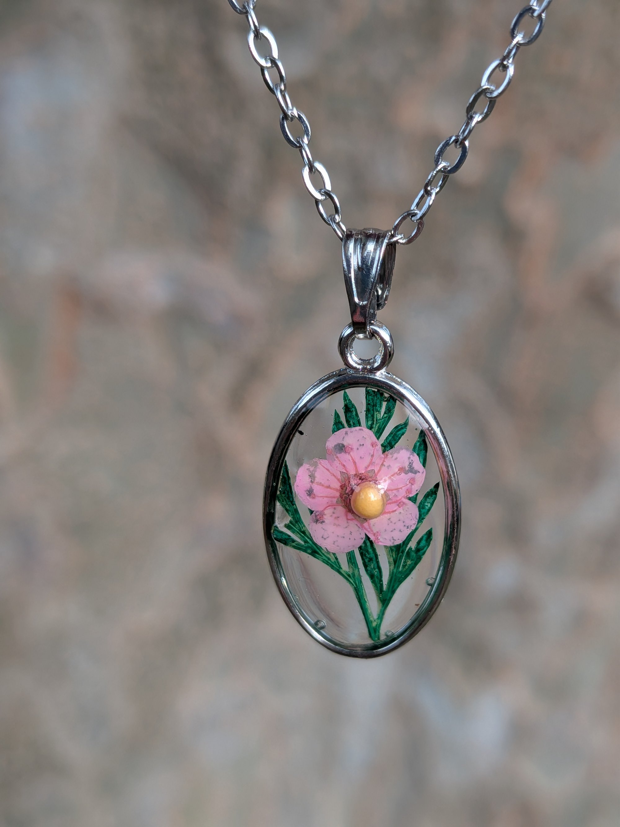 Stainless steel oval frame with a dried fern leaf and a pink Narcissus flower with a dainty mustard seed.