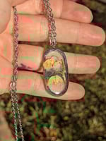 Dried and pressed Lilly of the Valley flowers from the Ukraine featuring sparkle epoxy, and a dainty yellow mustard seed in an oval stainless steel frame.