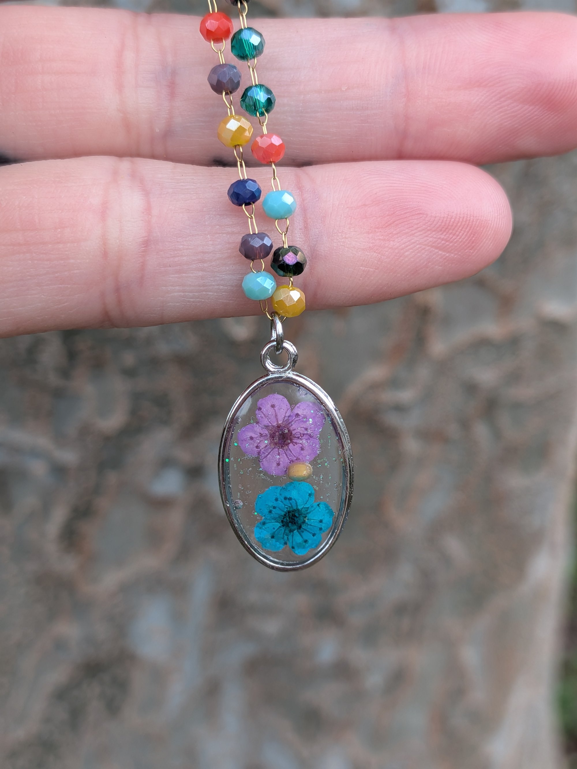 Oval frame featuring a dried purple and blue Narcissus flower, sparkle epoxy, and a dainty yellow mustard seed.
