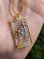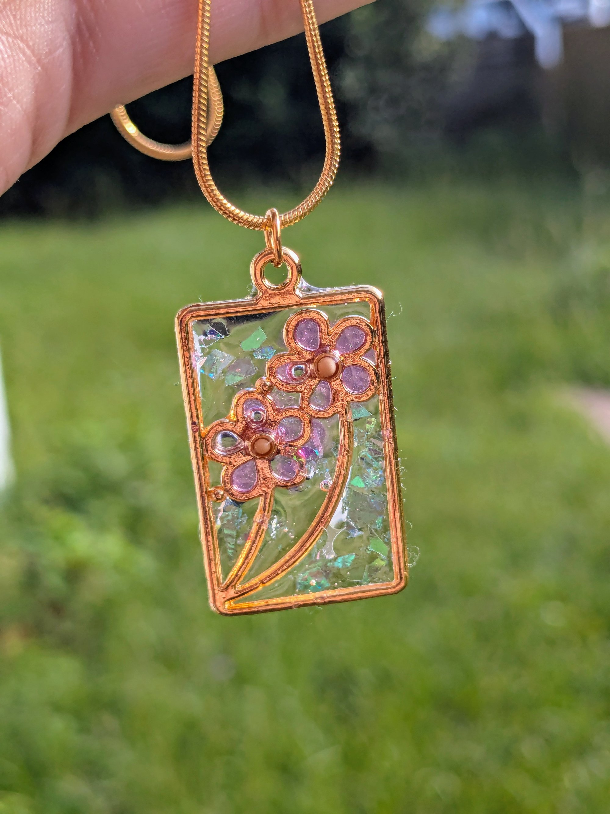 A gold plated rectangle frame with cute little flowers, featuring purple petals, mustard seeds, and a touch of cellophane glitter for your delight!
