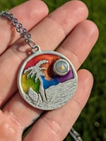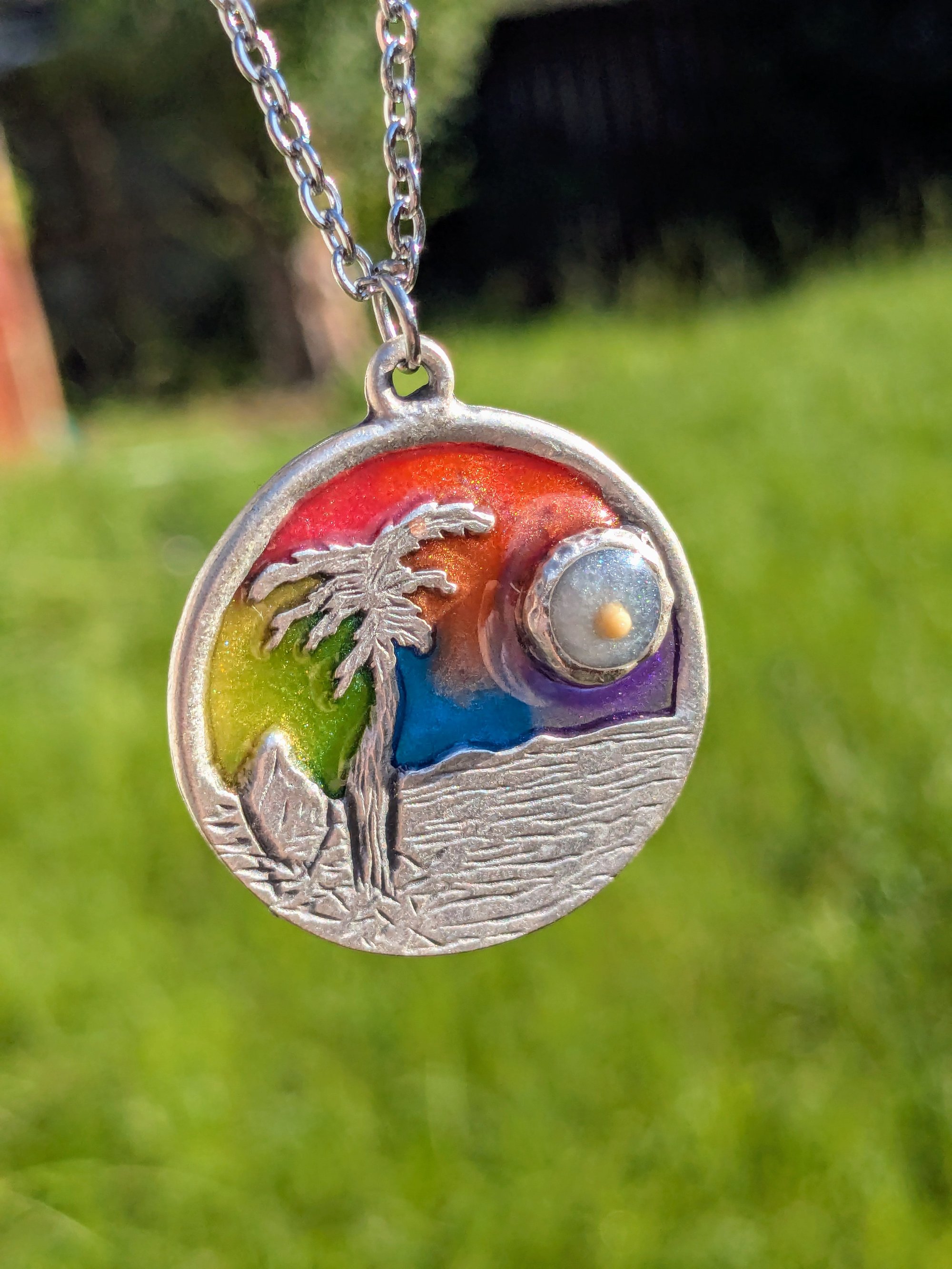 A serene palm tree/beach frame featuring shimmering rainbow epoxy as the sky, and pearl white epoxy as the full moon with a mustard seed.