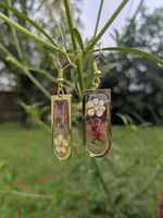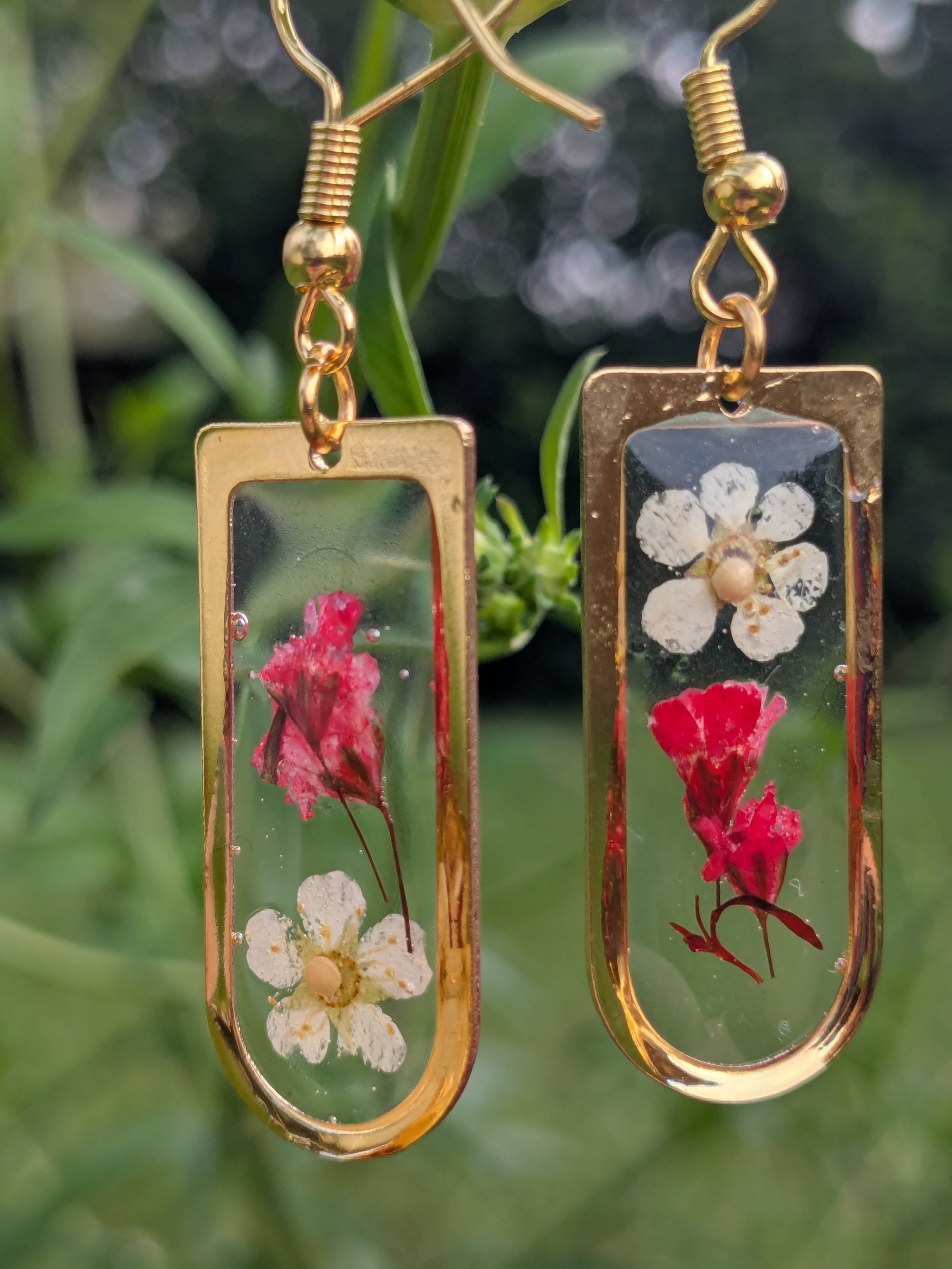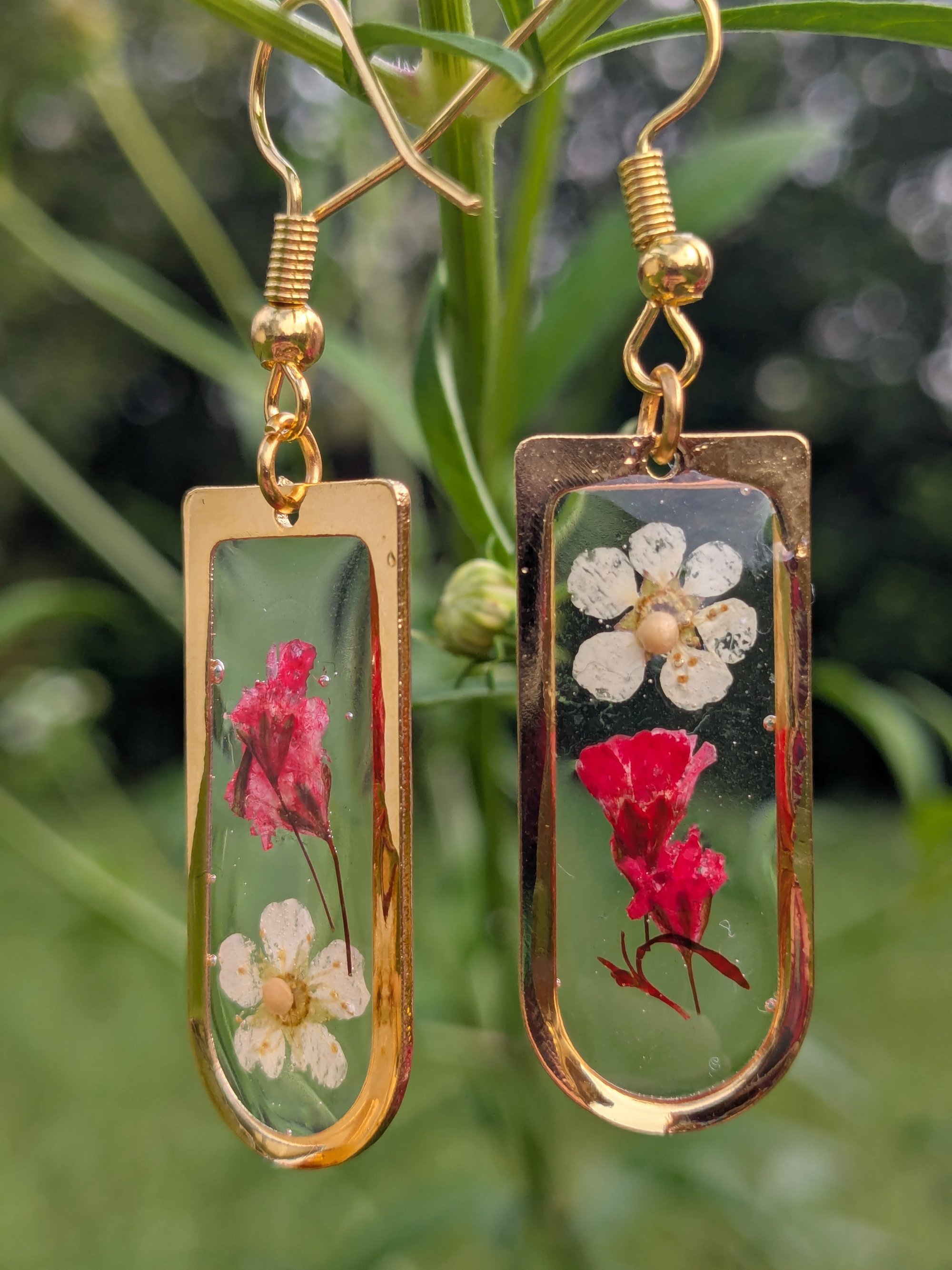 Gold plated dangle earrings featuring dainty red dried flowers, white narcissus flowers, and a yellow mustard seed.