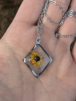 Dried mini sunflower from the Ukraine encased in clear epoxy and a stainless steel diamond shaped frame with a dainty yellow mustard seed.