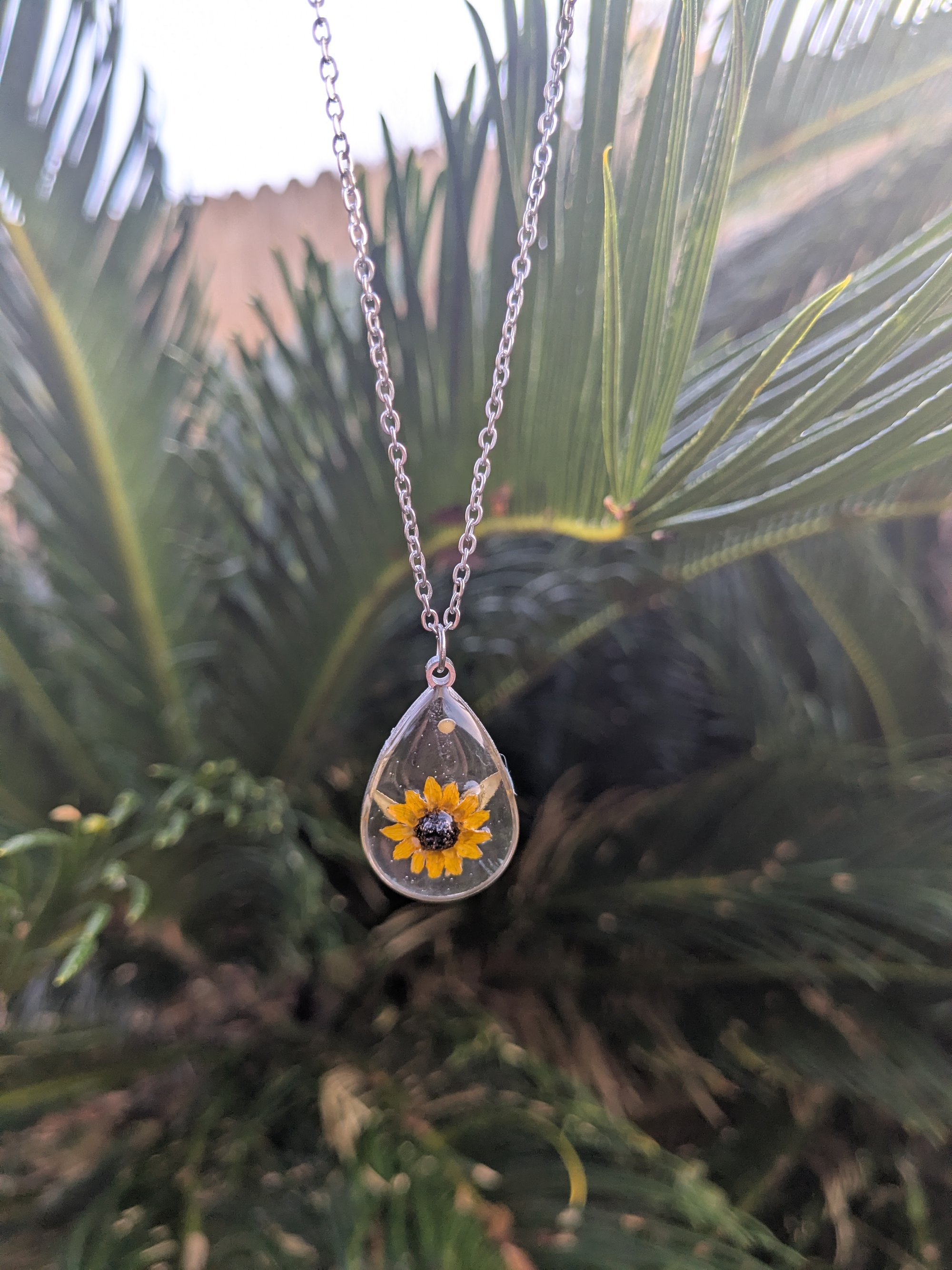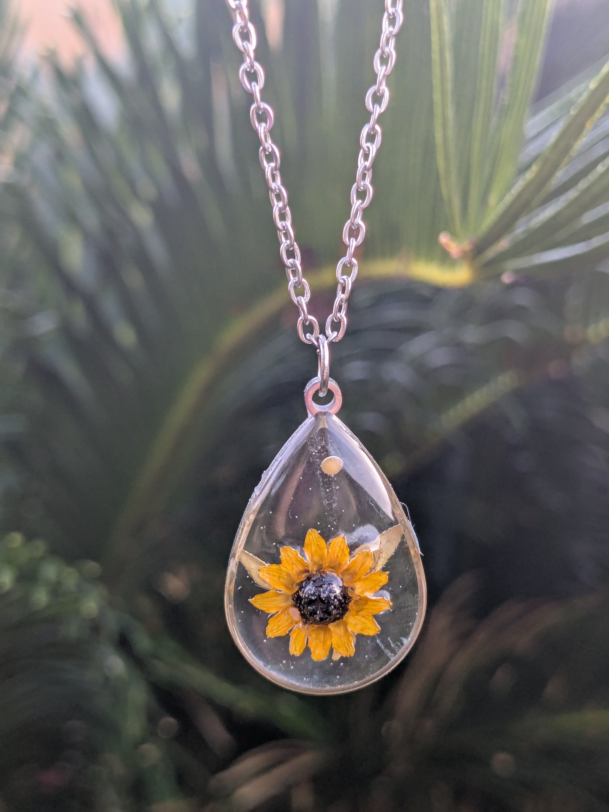Dried mini sunflower from the Ukraine encased in clear epoxy and a stainless steel teardrop shaped frame with a dainty yellow mustard seed.