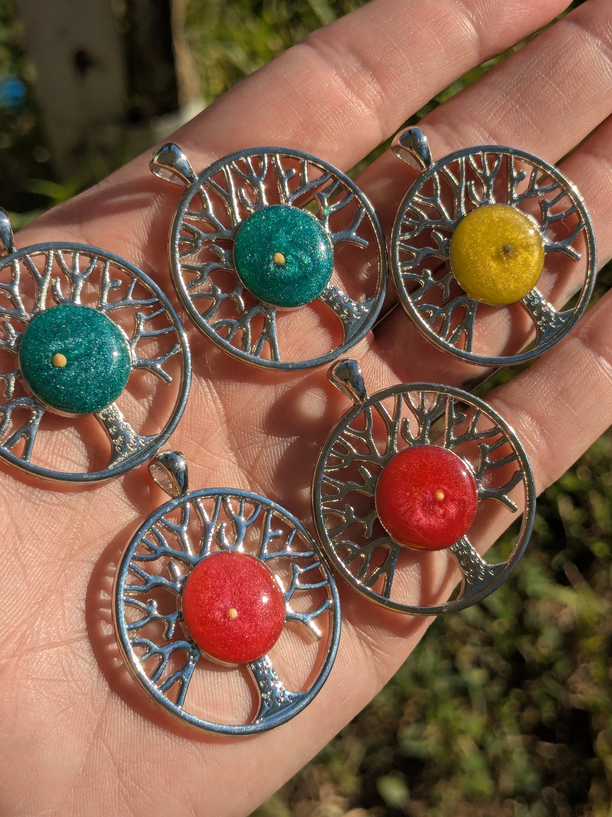 Tree of Life Pendants featuring sparkly turquoise, pink, or yellow epoxy and a dainty mustard seed.