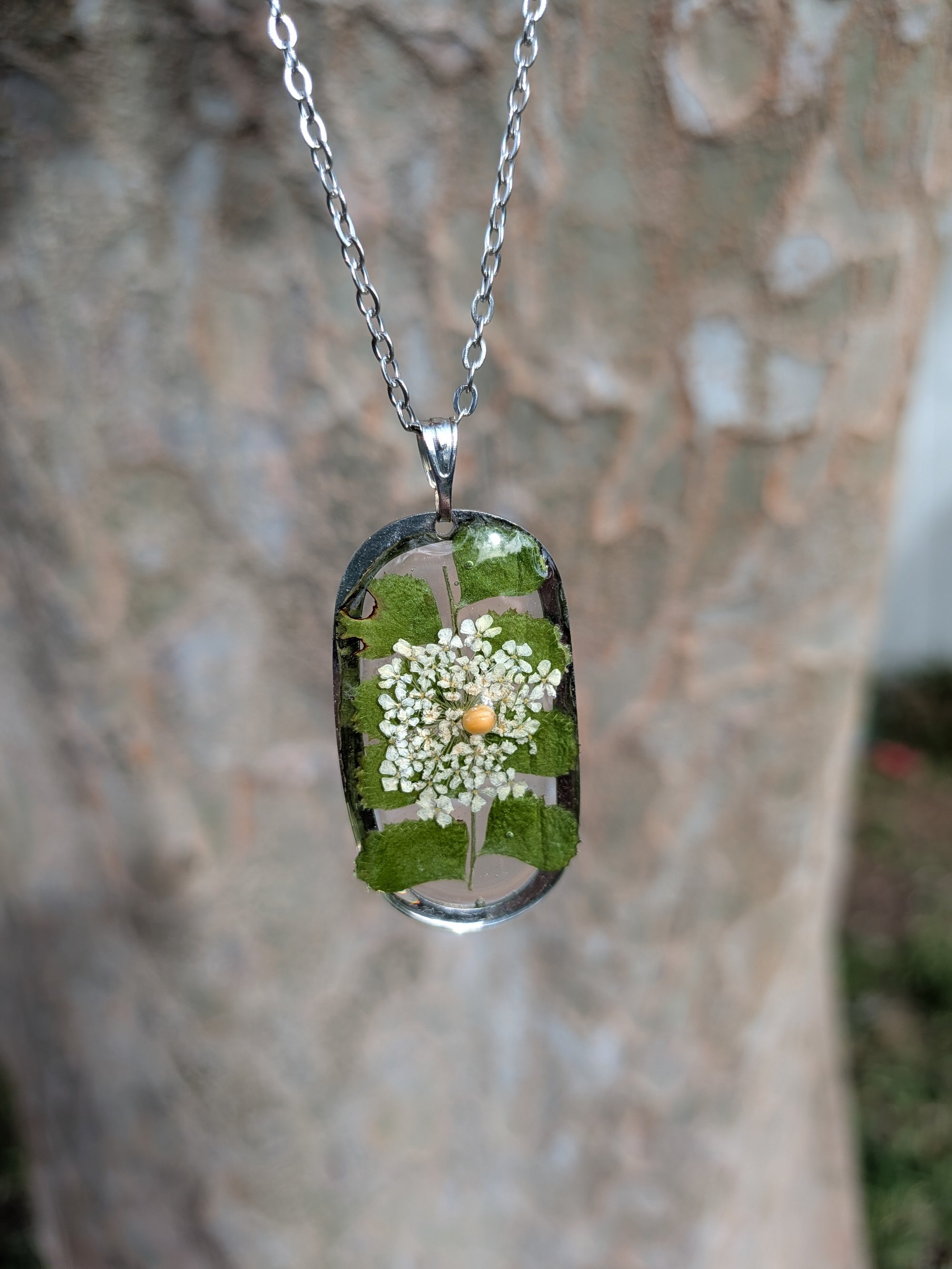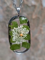 Stainless steel oval frame featuring a dried leaf and dried, white, Queen Anne's lace with a dainty yellow mustard seed and a 16" stainless steel chain.